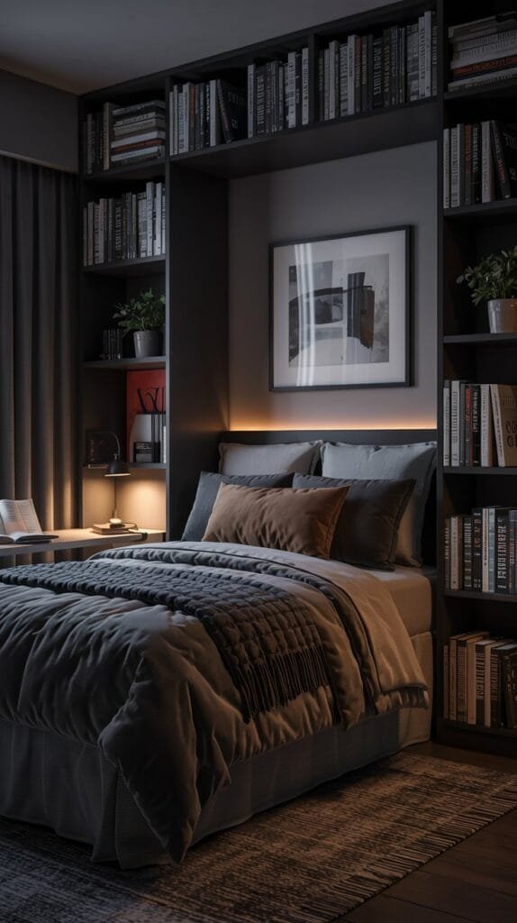 Industrial, but cozy. Black metal bed frame, dark gray bedding, and warm wood shelves. Soften it with a cinnamon throw and tan leather-look pillows.