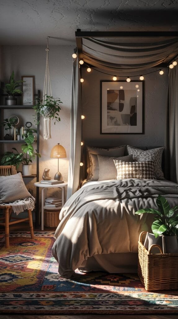 Hang a tapestry with subtle line art behind the headboard, and add macramé plant hangers with trailing pothos. A low-profile jute rug ties it all together, while string lights wrapped around the canopy create instant mood.