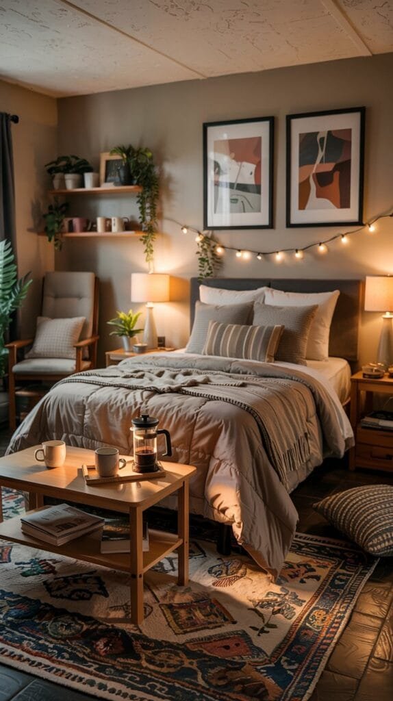 Imagine your favorite café, but it’s your dorm. Start with a caramel-and-espresso color scheme: chocolate knit throw, caramel pillow, cream boucle cushion. A small bistro table doubles as a study station with a retro radio nearby.