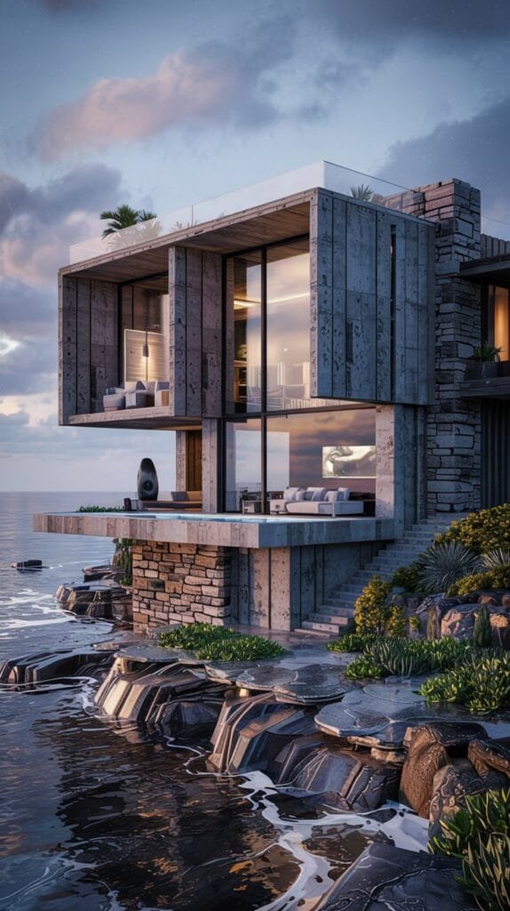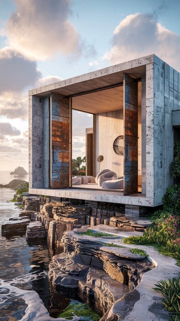 Think monolithic forms and clean lines that feel almost carved from the coastline itself. Concrete walls, oversized pivot doors, and steel accents make the architecture the star.
