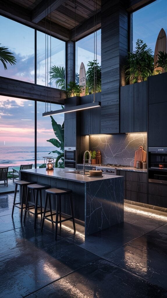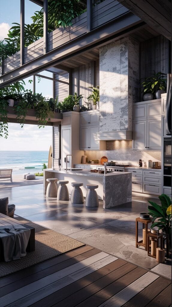 Modern beach house kitchens aren’t just for cooking; they’re for lingering. Think clean-lined cabinetry, natural stone countertops, and oversized windows that let you cook with the ocean breeze on your face.