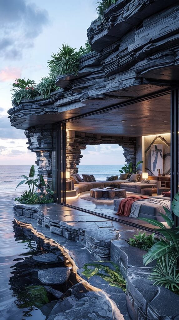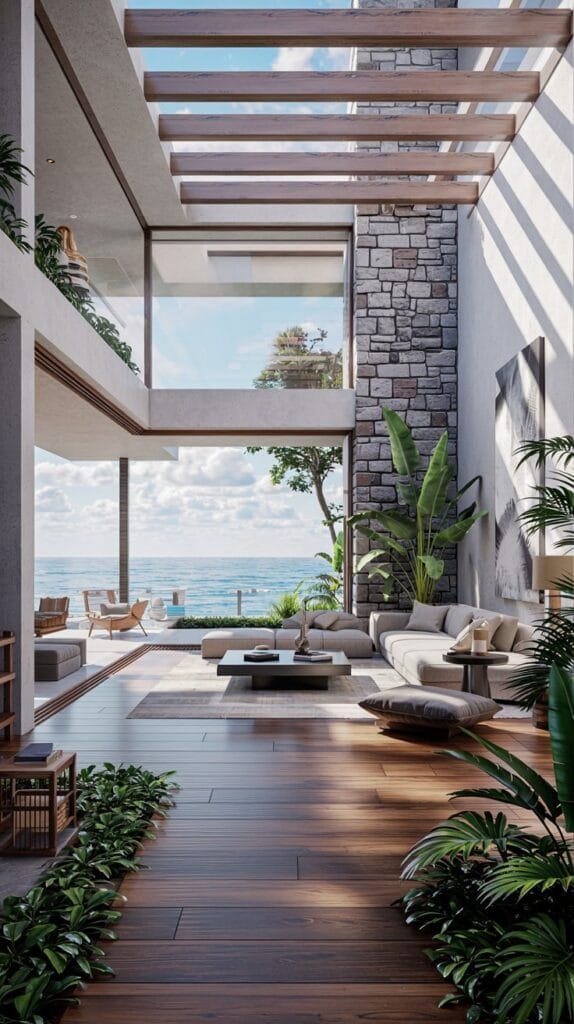 Nothing beats a living room designed around the view. I love using natural stone walls, timber accents, and low-profile furniture to keep the eye drawn outside.