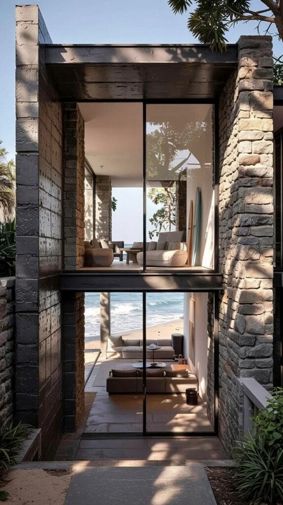 I’m obsessed with how a single wooden bench or a raw stone fireplace can completely soften a modern beach house interior.