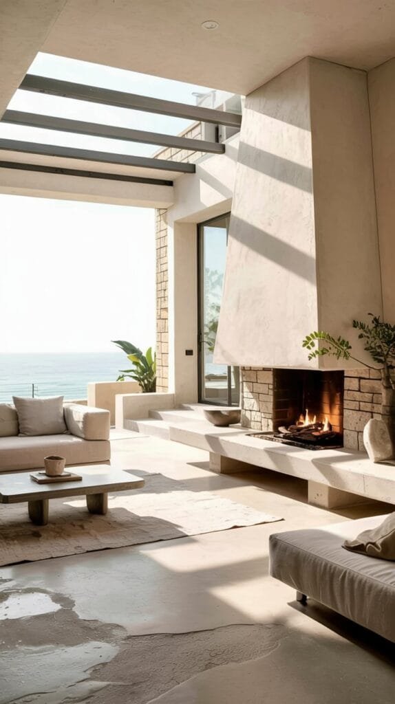 Who says brutalist minimalism can’t be cozy? Timber accents, smooth plaster, and earthy stone balance the hard edges with natural warmth.