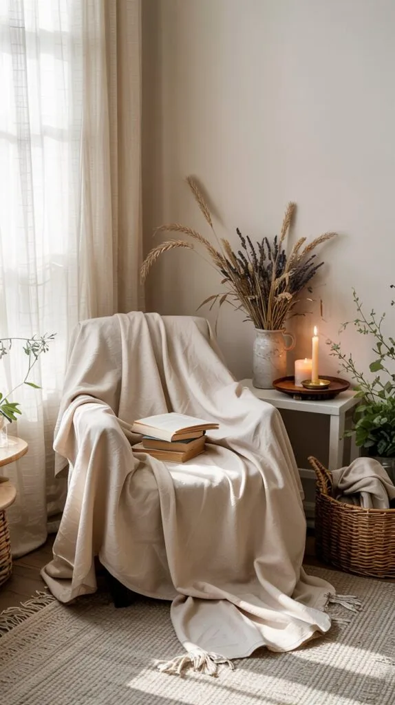 Try this: thrifted wooden chair, cream throw, and a small plant on the windowsill. It’s simple but looks intentionally styled.