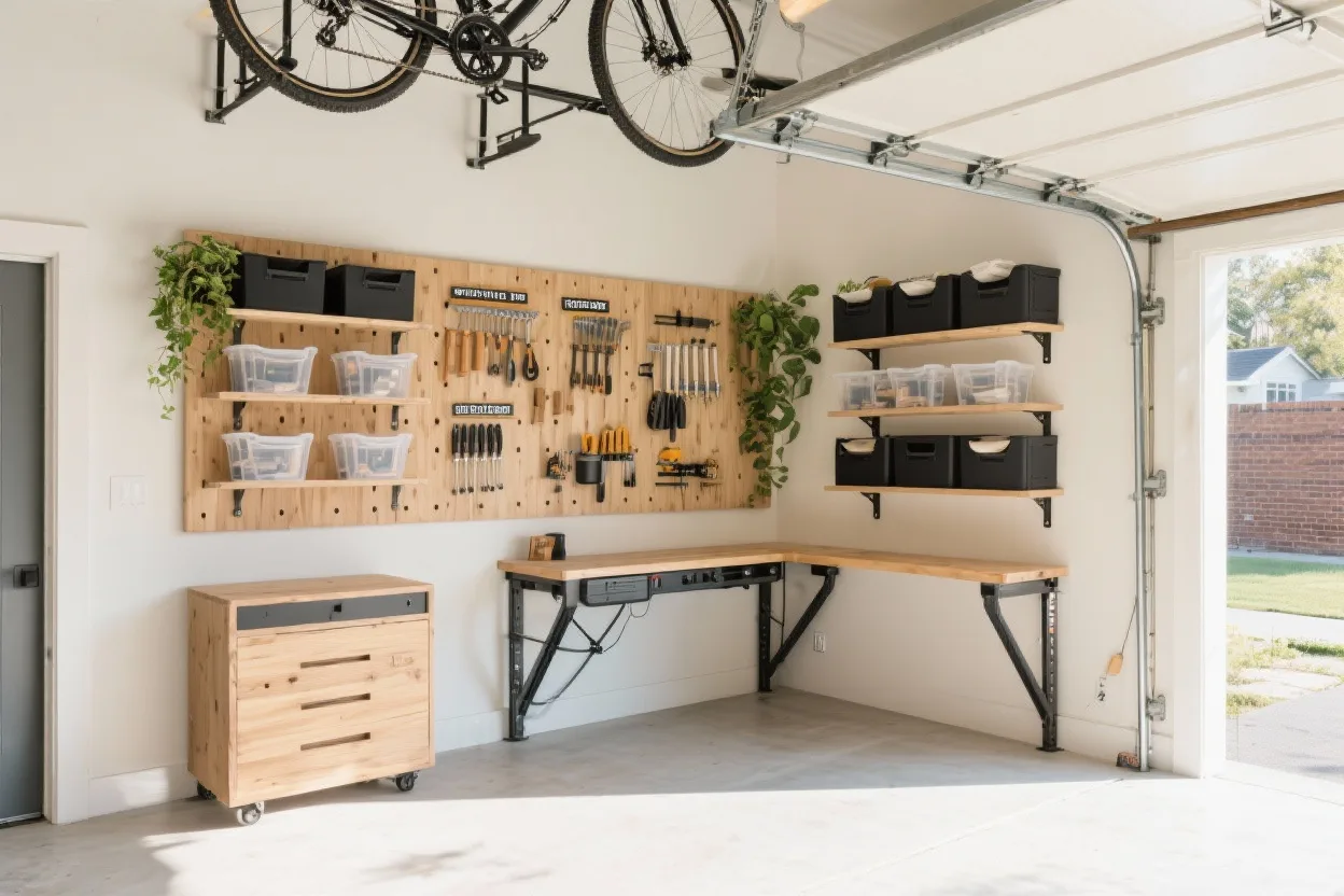 Think calm, clean, and clever. This garage corner feels like a mini studio where every tool has its place and the vibe is cozy-modern. It’s all about warmth and order without feeling sterile.