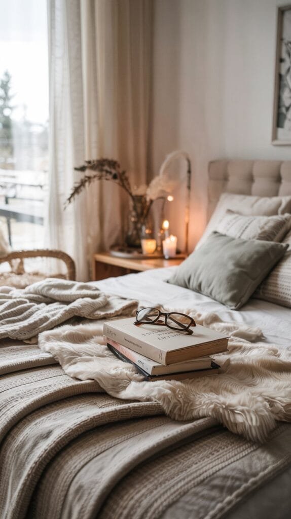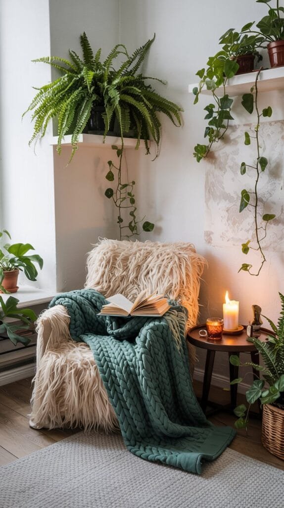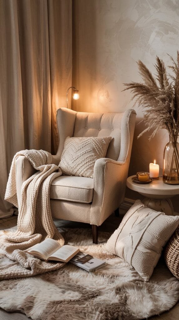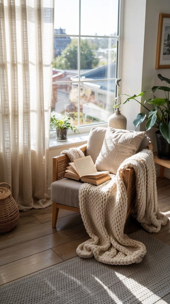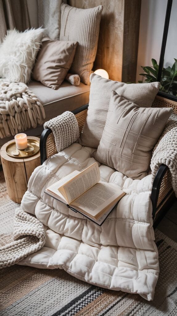 A great reading nook feels like a cocoon. Pile on thick blankets, textured cushions, and a plush rug. Mix knits, faux fur, or boucle to create depth — even if the palette stays neutral.