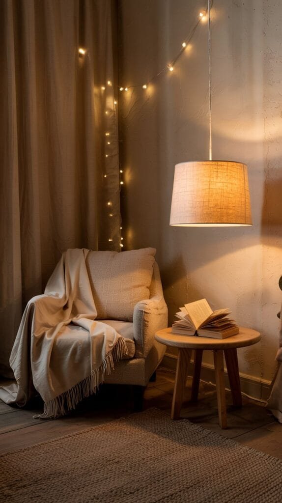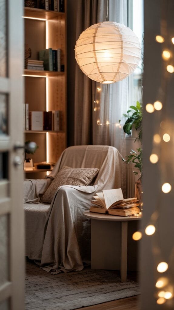 Warm LED fairy lights, clip-on reading lamps, or small table lamps with linen shades are all affordable ways to add cozy, indirect light.