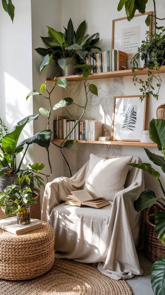 Even one plant can transform the feel of your reading space. Choose low-maintenance greenery like a pothos or snake plant.