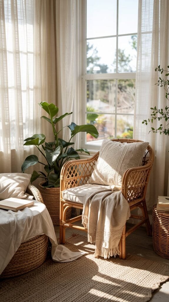 Add a soft linen curtain to diffuse sunlight during the day — it keeps the look effortless and cozy rather than harsh or clinical.