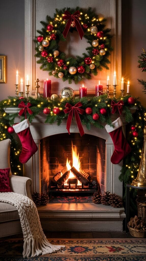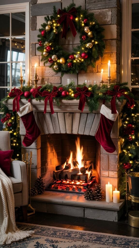 Layer in Christmas fireplace decor that feels collected: mismatched brass candlesticks, oversized pinecones, and velvet stockings that pool on the floor.