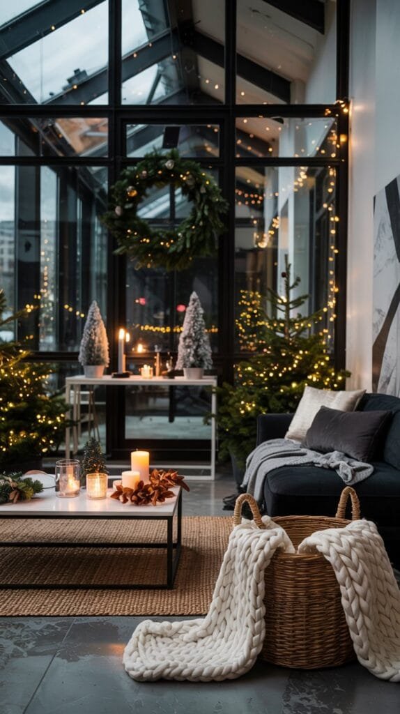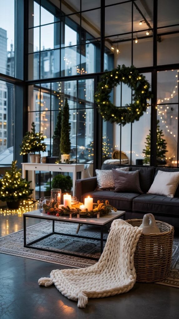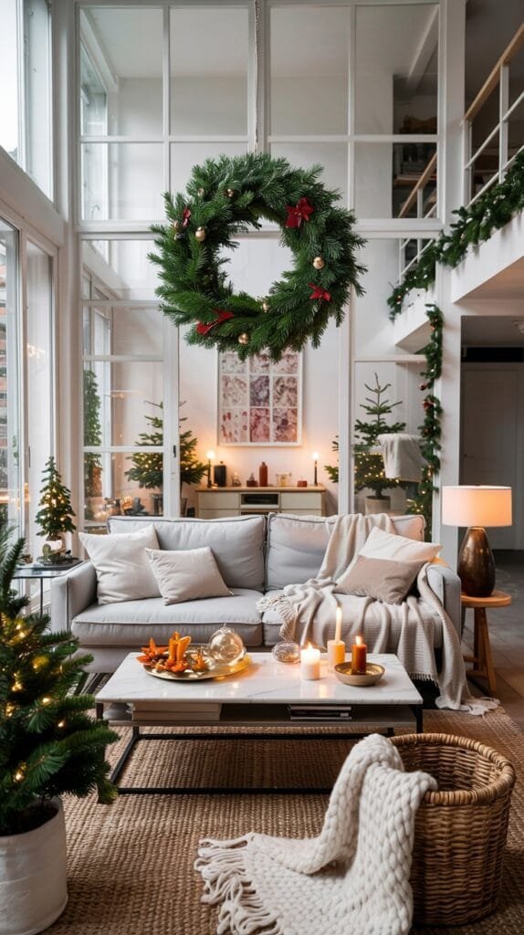 Drape garlands across doorways or cluster tiny tabletop trees on a console. A small space loves scale play — one oversized wreath over the sofa instantly becomes an art piece.