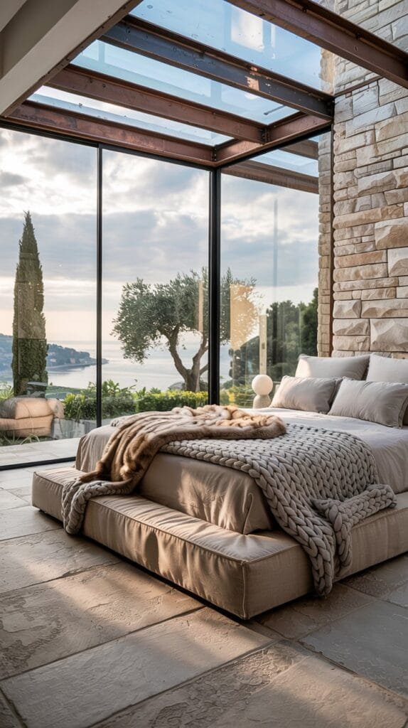 Rustic meets modern with natural stone walls and minimalist timber furniture—an Earthy Modern Bedroom idea that brings the outdoors in.