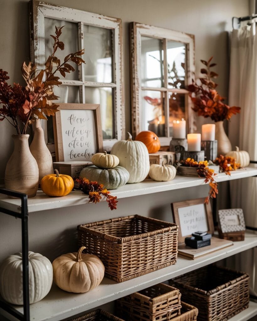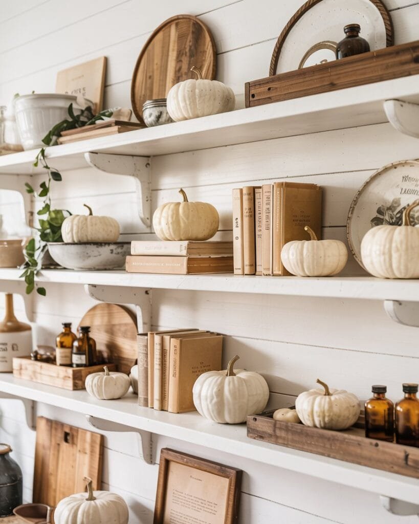 3. Simple Farmhouse Shelving with Vintage Fall Touches