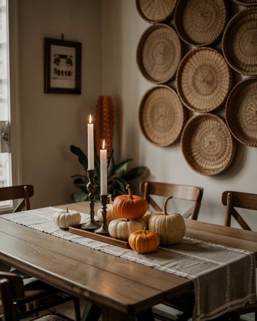 Wicker basket walls have made a huge comeback, but the trick is to keep it curated. Stick to natural tones, vary the sizes, and layer in a few vintage plates or wooden accents to avoid it feeling too matchy. Pair with cozy fall touches like neutral pumpkin accents or a woven throw nearby for that subtle seasonal upgrade.