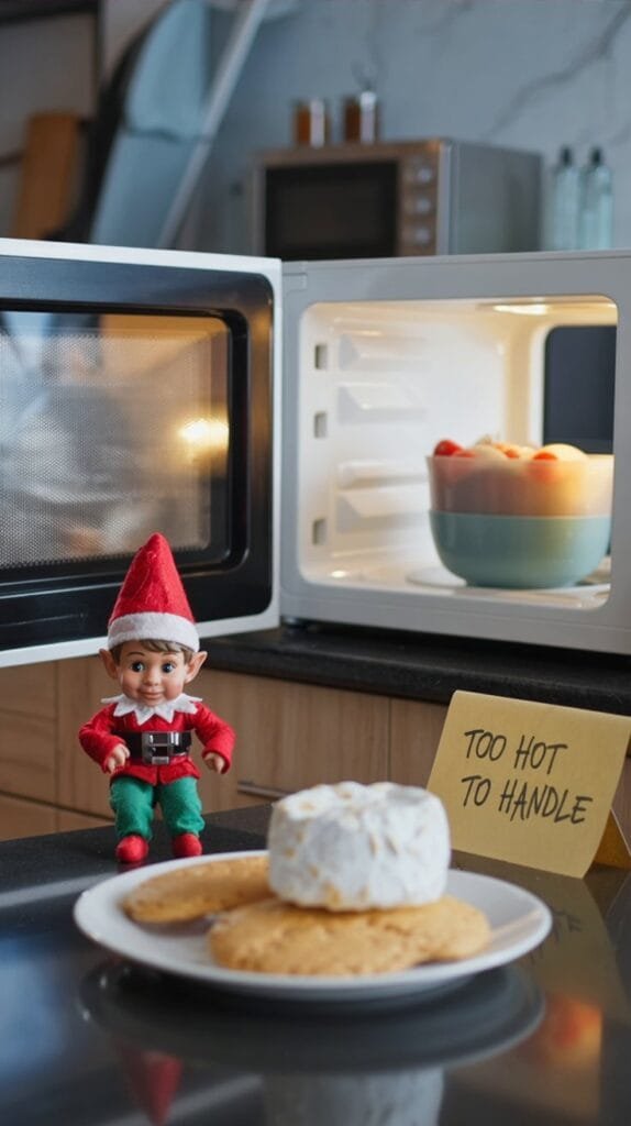 Microwave scene — Elf beside a marshmallow puddle and broken graham cracker. Text idea: “He flew too close to the microwave sun.”