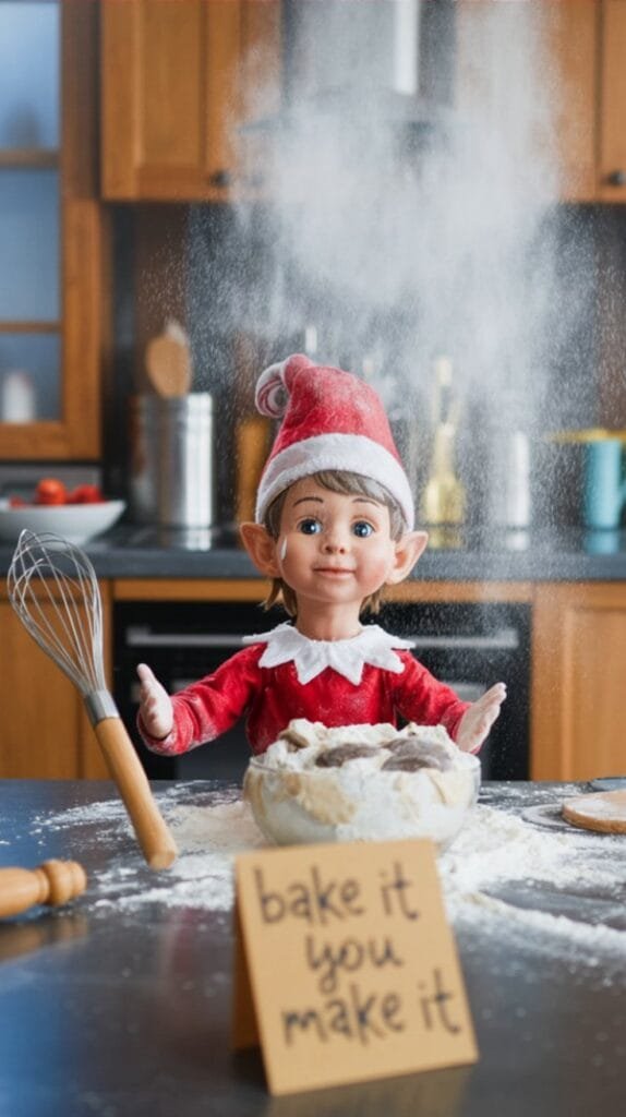 Cover a countertop with flour, Elf in the middle holding a whisk like it’s been baking for 12 hours. Add handprints and a note: “Bake it till you make it.”