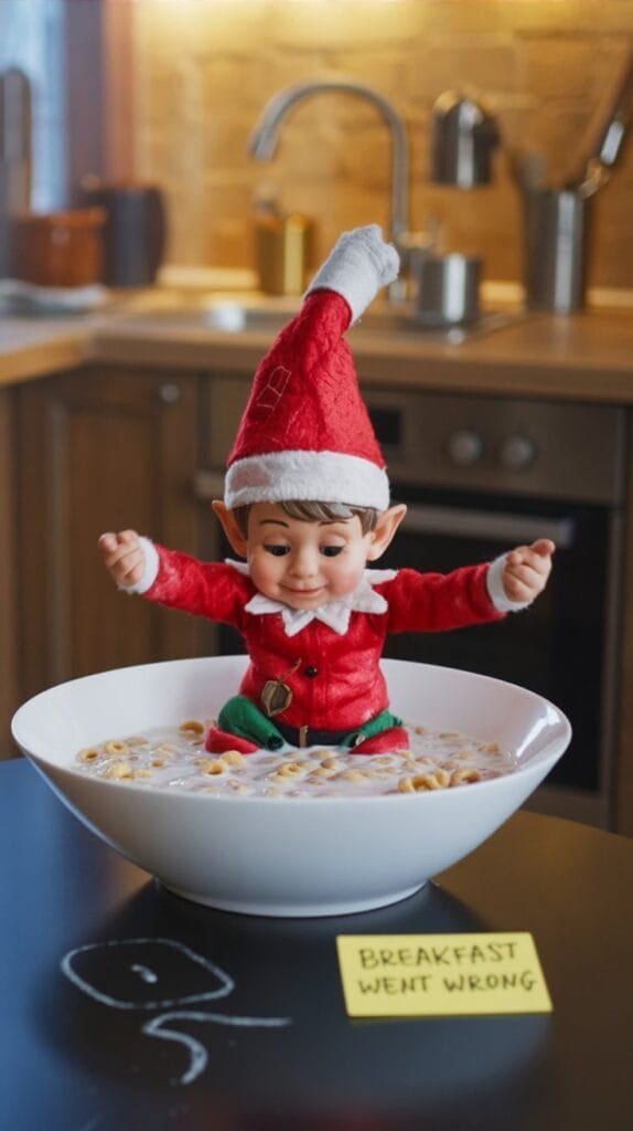 Elf face-down in a cereal bowl with a chalk-outline made from spilled Cheerios. Use a note: “He never saw breakfast coming.”