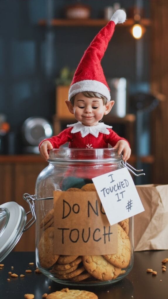 Elf halfway up the cookie jar with crumbs everywhere. Tape a “WANTED” poster beside it. Caption: “Caught crumb-handed.”