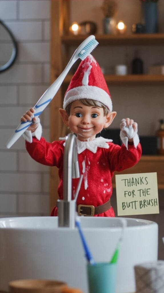 Your elf’s standing beside an upside-down toothbrush with a tiny note reading: “THANKS FOR THE BUTT BRUSH.” It’s gross, it’s perfect, it’s viral-worthy.