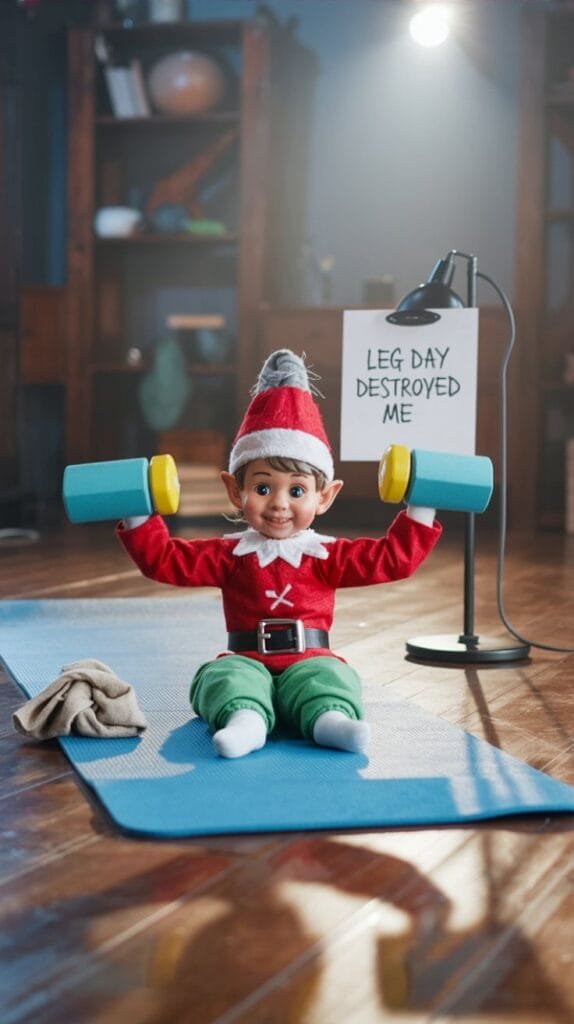 Tiny dumbbells (toothpicks + mini marshmallows). Elf sweating under a desk lamp spotlight with a sign: “Leg day destroyed me.”