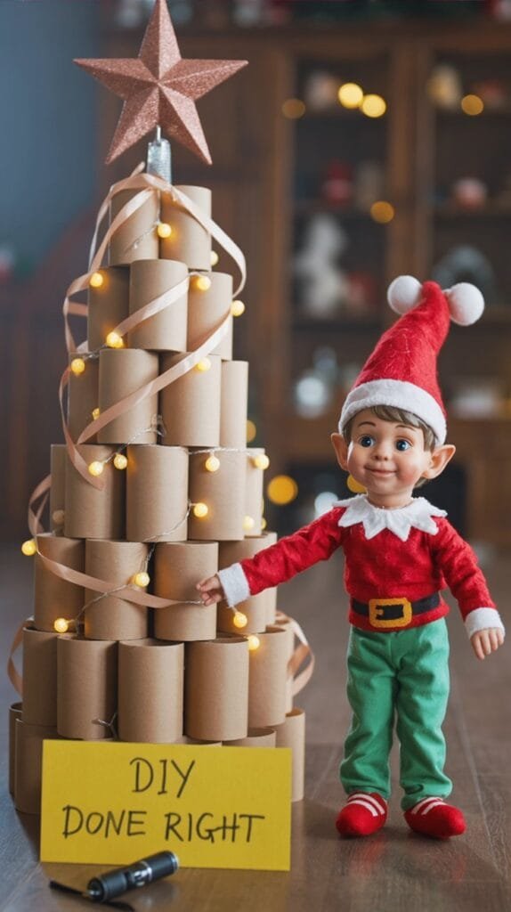Build a mini Christmas tree from stacked toilet rolls. Elf proudly presenting it with a sign: “Saving trees, one roll at a time.”