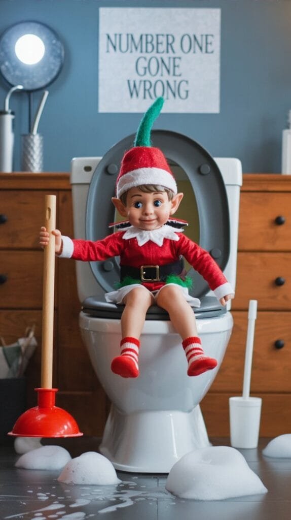 Elf sitting on the toilet holding a plunger dramatically. Add a speech bubble: “I said I was number ONE, not doing number TWO.”