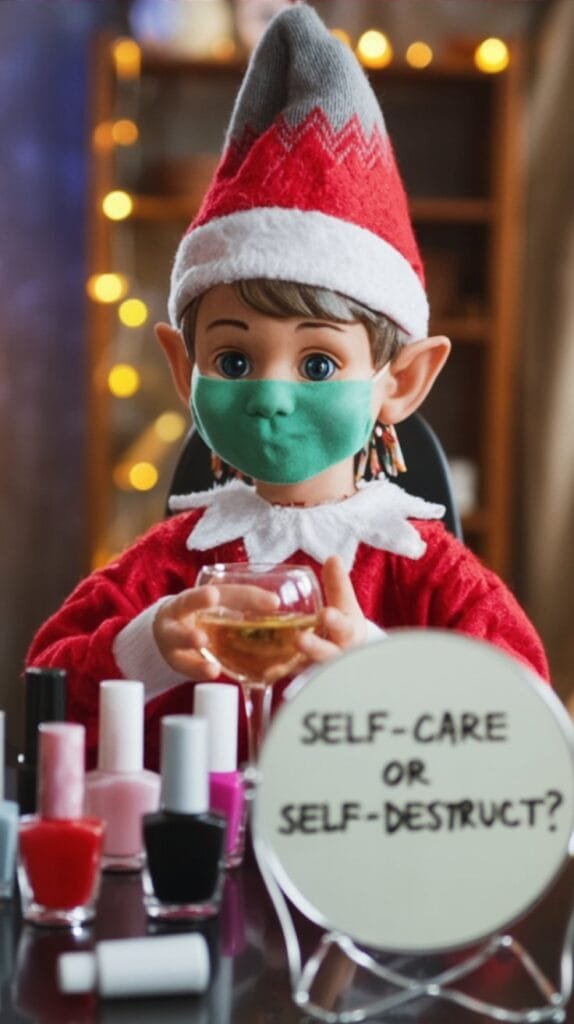 Elf surrounded by nail polish bottles, eye patches, and a spilled drink. Tagline: “Mentally I’m still on the North Pole.”