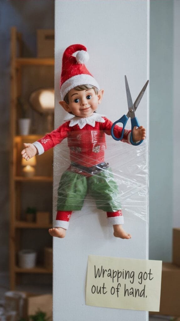 Wrap Elf completely in clear tape, stuck to the wall mid-escape. Label: “Operation Gift Wrap: failed.”