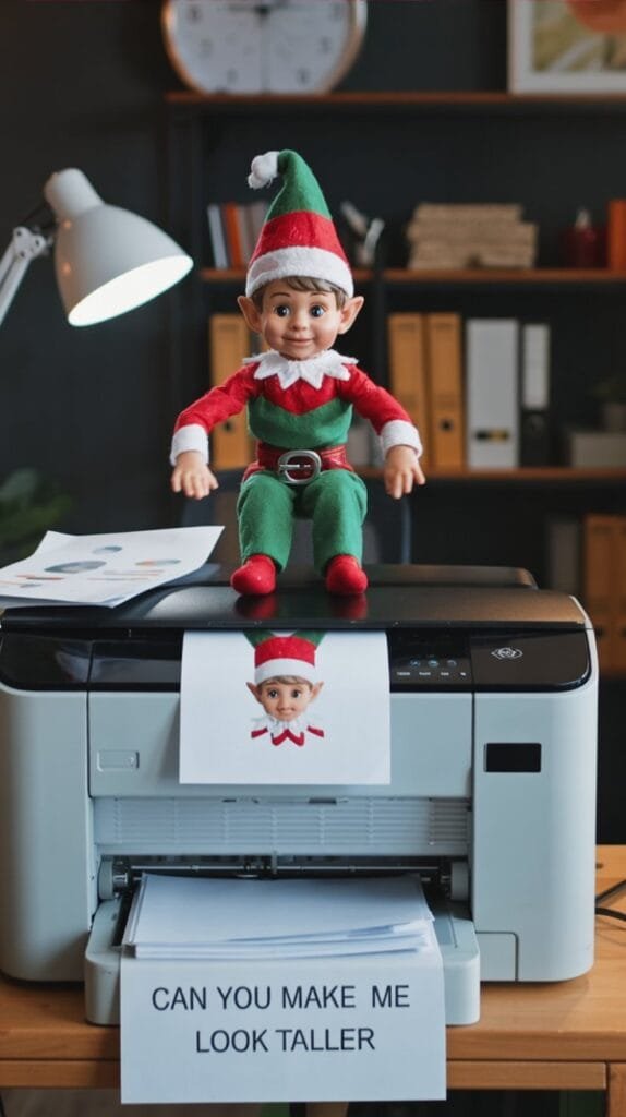 Stick the Elf to the printer with tape and a freshly printed photo of its flattened face. Note says: “Can you make me look taller?”