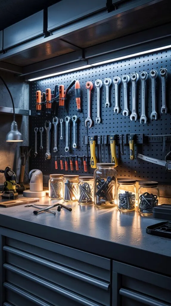 Slim tool walls feel architectural when you use perforated metal boards instead of plastic.