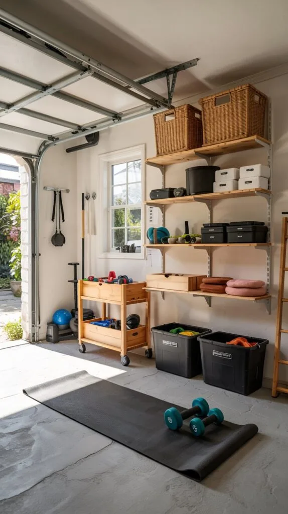 One-car garages are the new hybrid spaces: half storage, half workout zone.