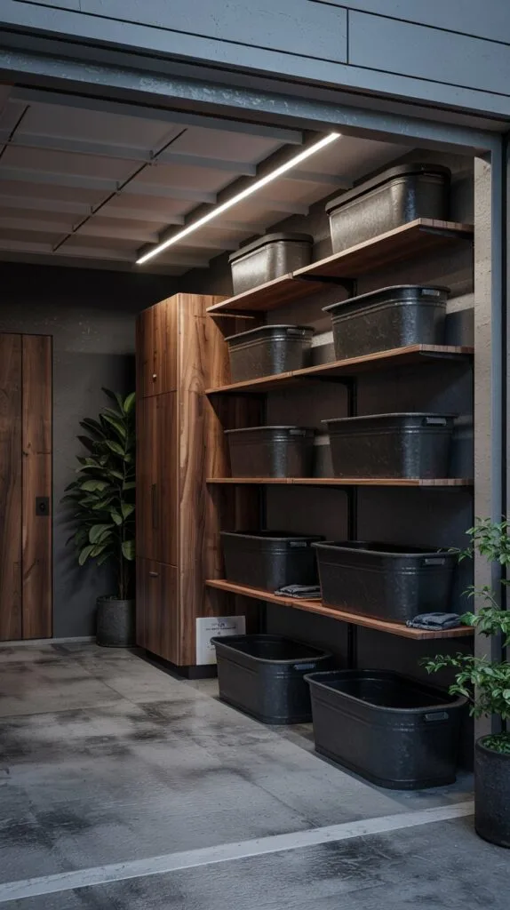 Think clean-lined shelving, matte black hooks, and matching storage tubs that actually look good when the door is up.
