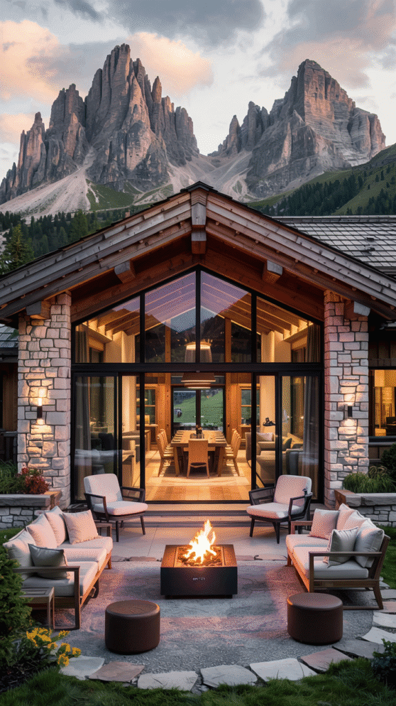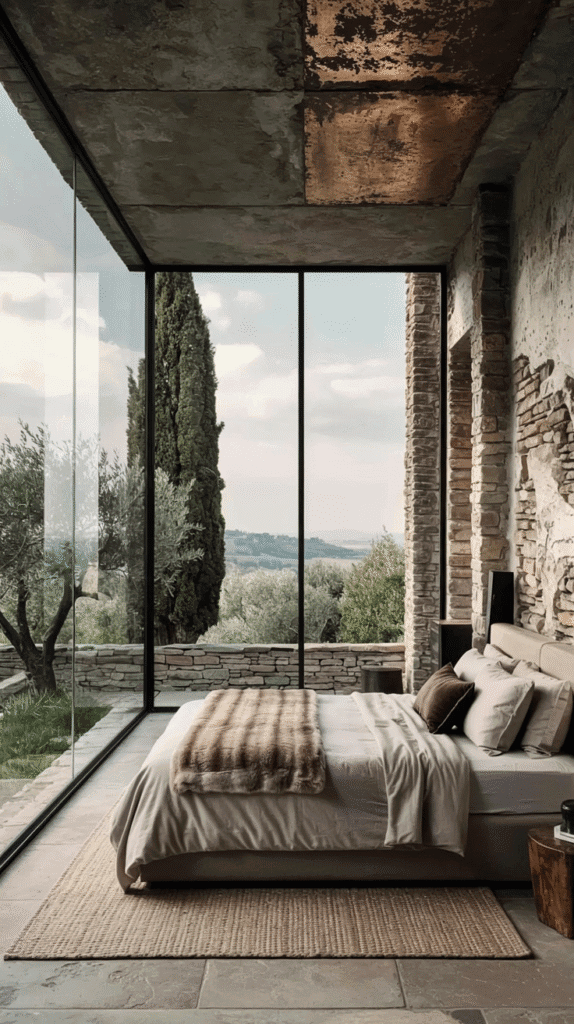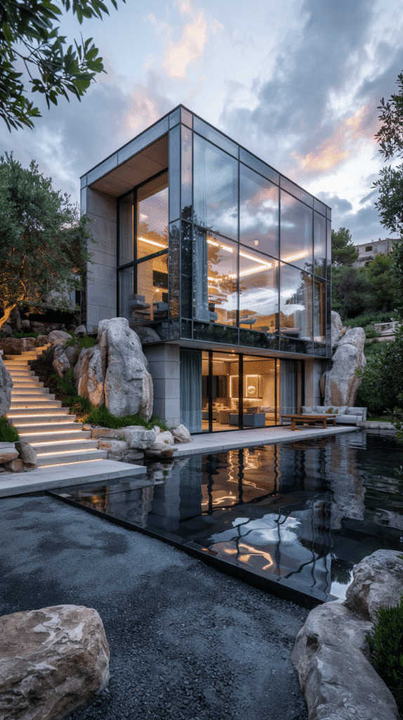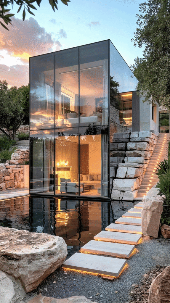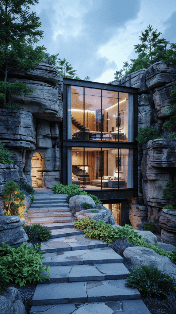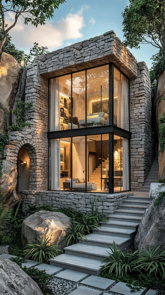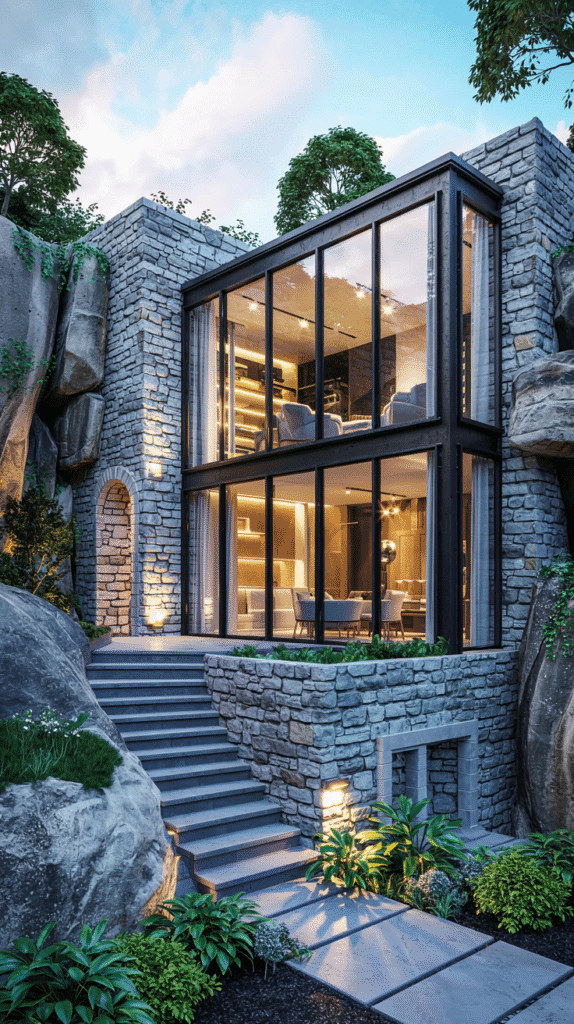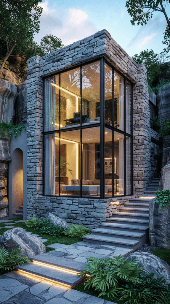Floor-to-ceiling panels give this stone retreat a modern soul. The interior glow contrasts beautifully with the rugged stone for an atmospheric, cocoon-like feel.