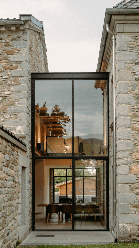 Subtle and bold, this smoked-glass entry frames old stone with contemporary restraint, ideal for creating a sense of arrival and contrast.