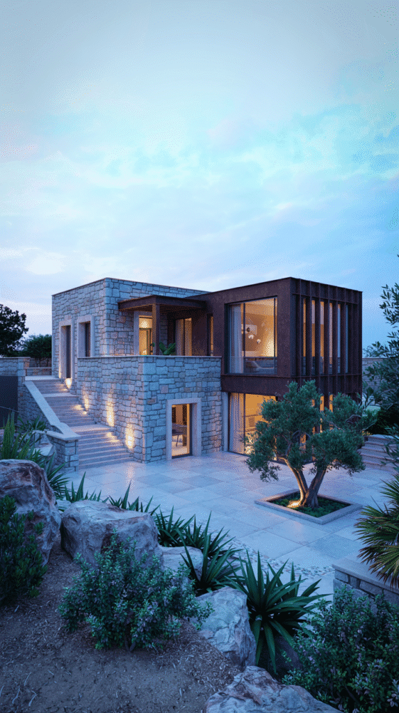 This design burrows into the terrain and emerges as a glowing glass form, ideal for hilly Mediterranean or rocky plots where harmony is key.