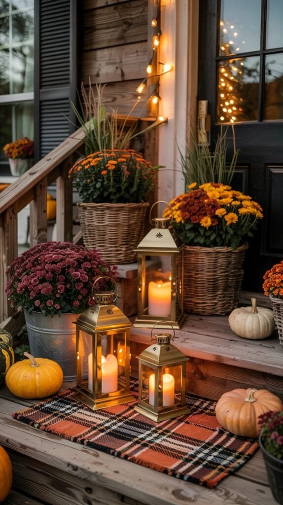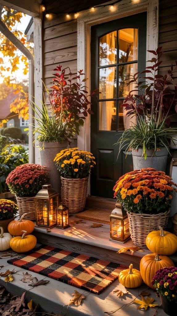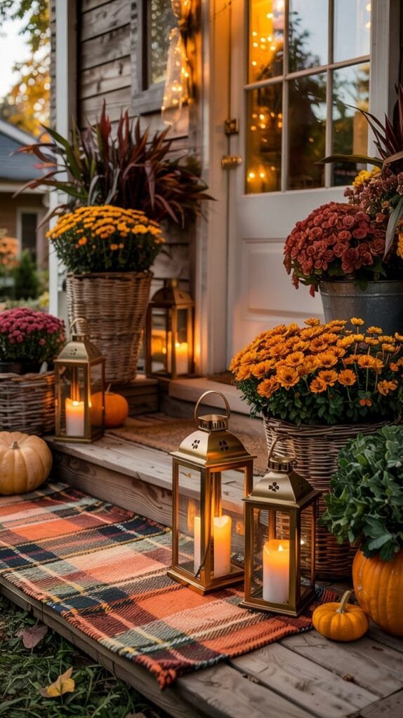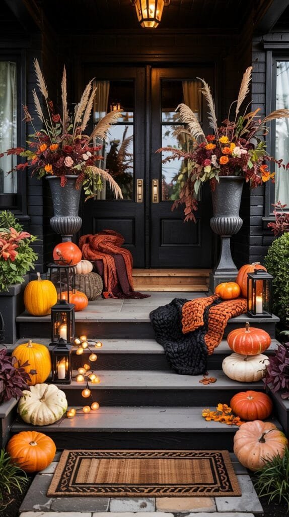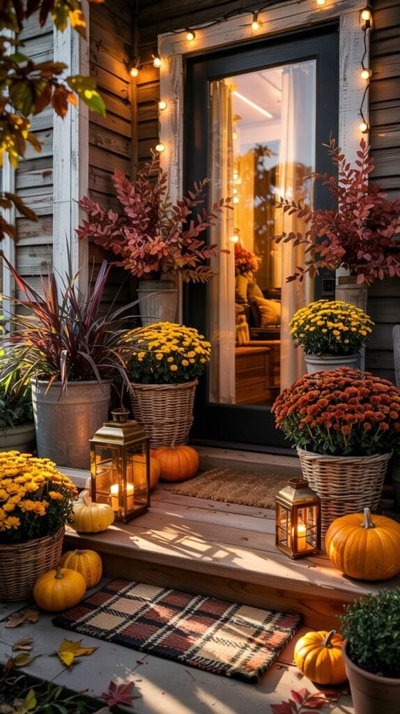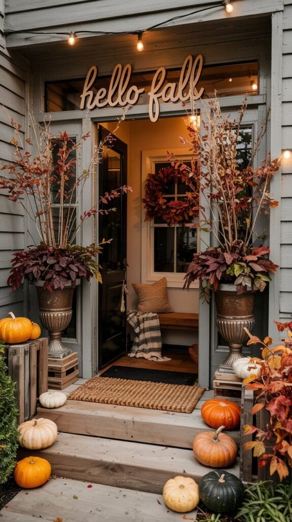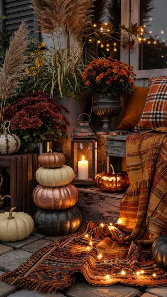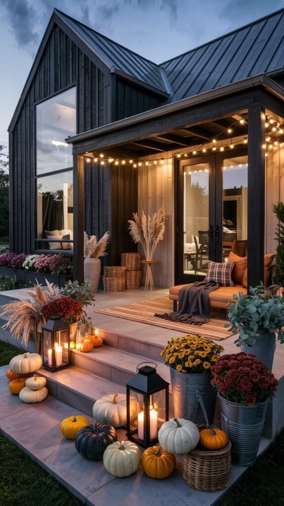 I’m also a fan of symmetry here: two matching urns brimming with seasonal blooms instantly feel high-end. Add twinkle lights or Edison-style bulbs, and suddenly your fall patio decor feels like it could be on the cover of a magazine.