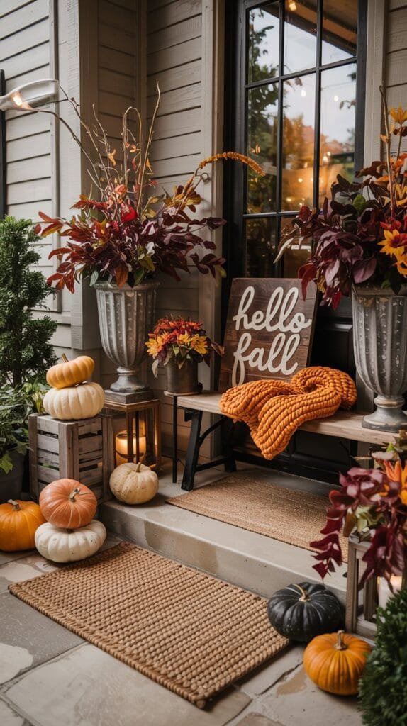 Pair it with a bold statement sign (“Hello Fall” in carved wood always hits) to balance softness with a focal point.