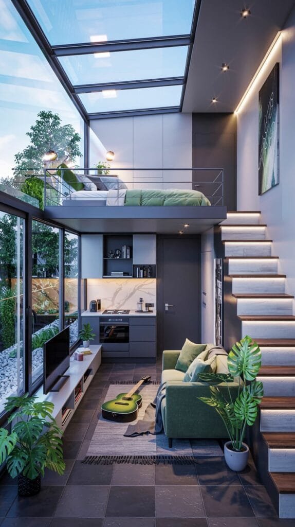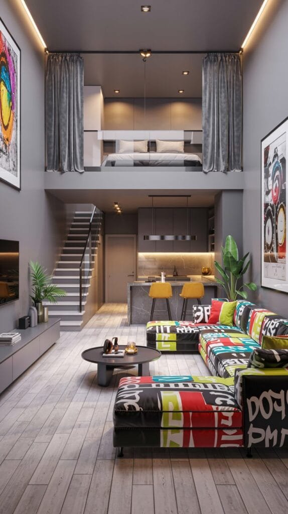 Tip: If you’re styling a mini loft apartment, steal this palette—matte neutrals, low-slung furniture, warm LEDs tucked under cabinetry. Even a small space stretches taller when you keep surfaces light and let shadows do the talking.