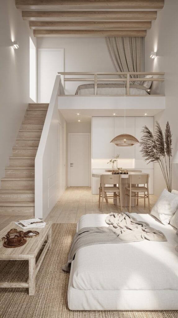 Lofts thrive on open ceilings, so keep the palette pale and natural — white walls, blonde wood beams, soft linen drapes.