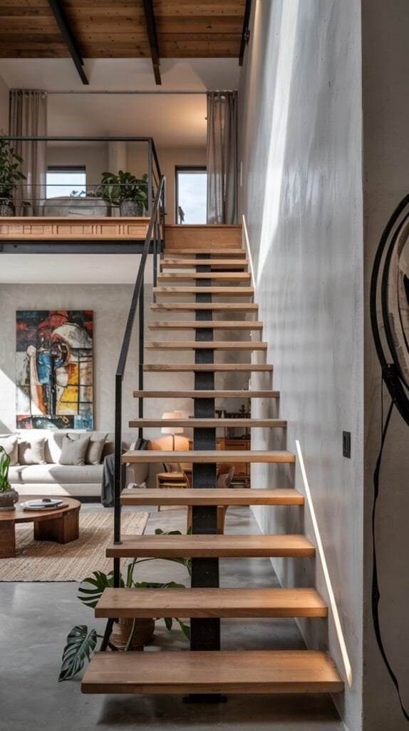 Think: minimalist railings, light oak treads, and hidden LED strip lighting that glows softly at night.