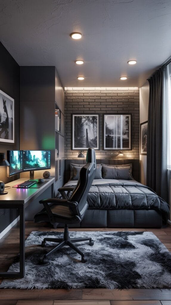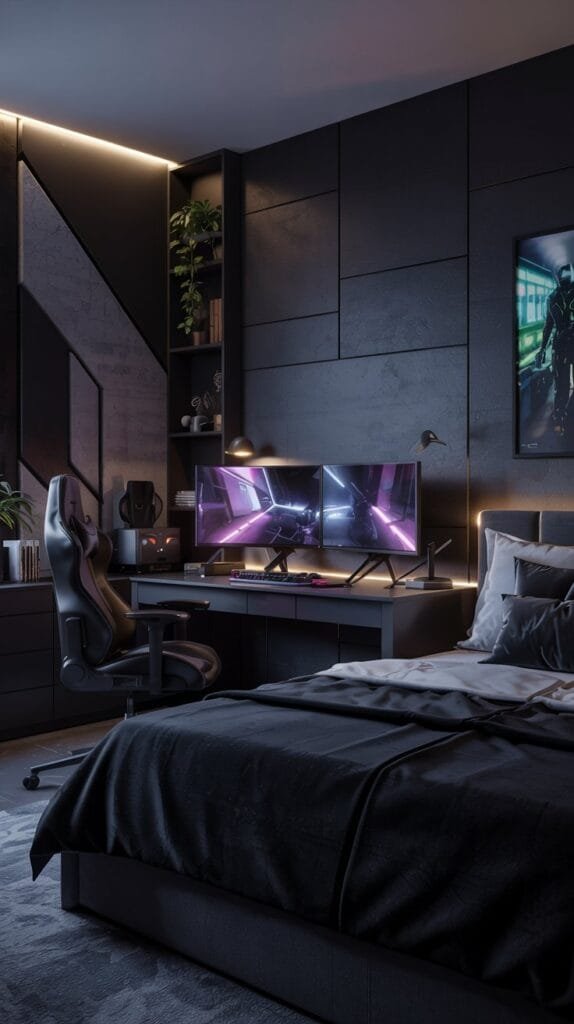 Perfect for smaller spaces, this gaming bedroom idea uses a sleek corner desk, dual monitor setup, and minimalist black accents. Add soundproof panels for a functional yet stylish small room setup for men.