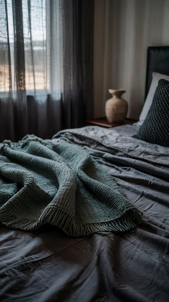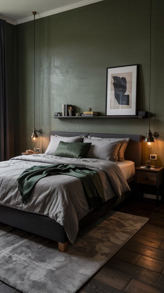 Add depth with dark green bedroom ideas. A forest green accent wall pairs perfectly with charcoal bedding and minimalist black furniture. This color combo delivers calm, masculine energy without feeling cold.