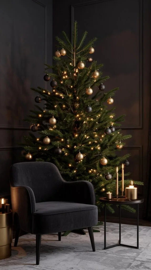 For a bold yet minimal statement, pair matte black ornaments with brushed gold accents.
