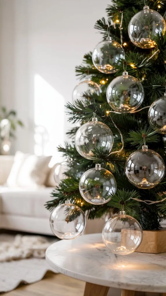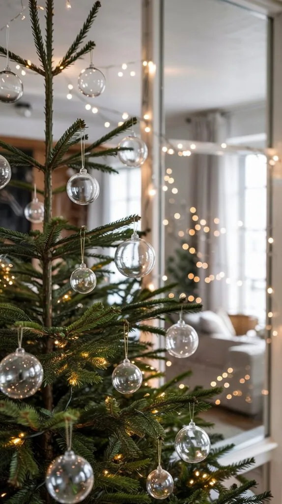 Keep things light and airy with transparent ornaments and warm LED fairy lights.