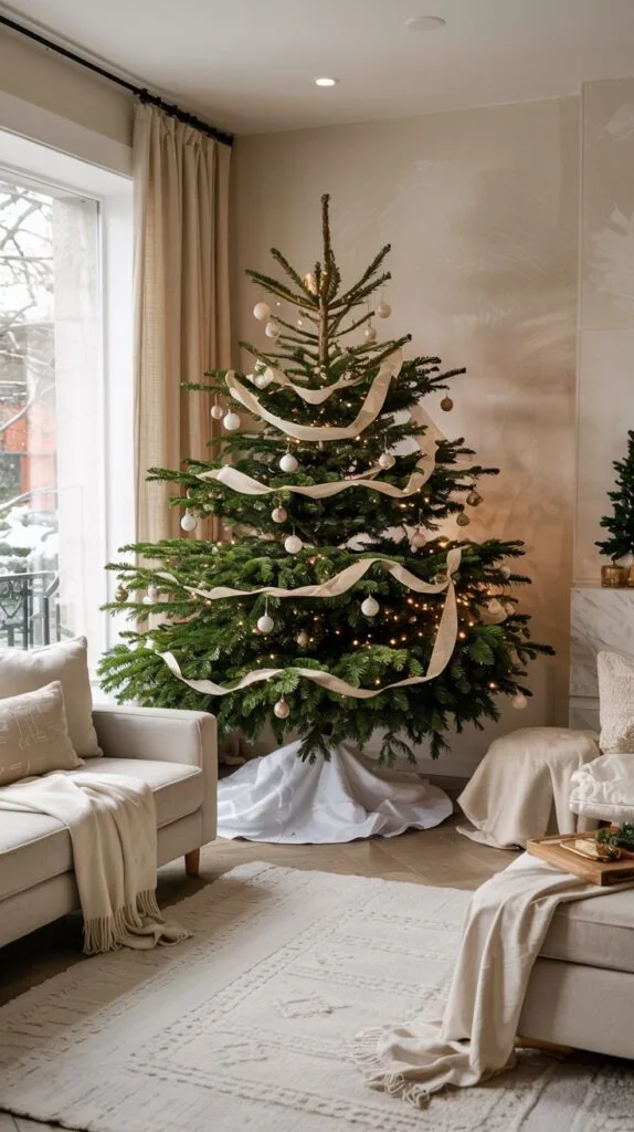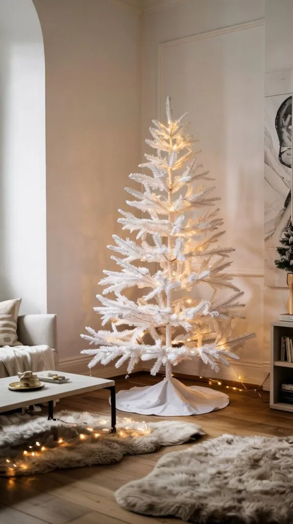 A frosted or all-white tree decorated with subtle gold or silver accents feels clean and refined.