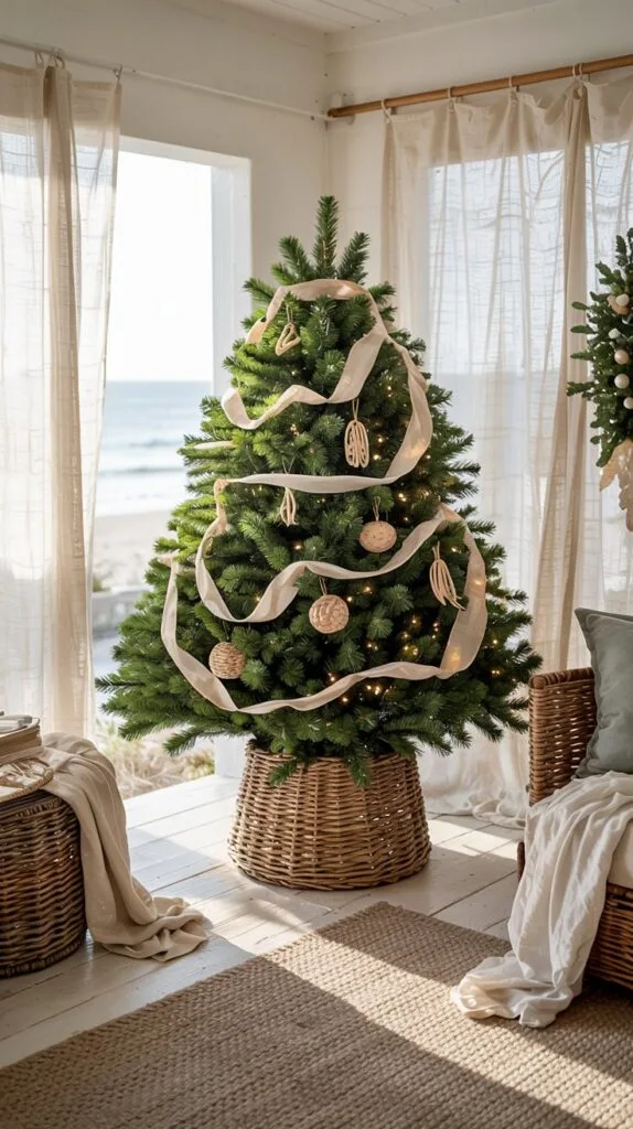 Use linen ribbons or bleached wood ornaments for a coastal Christmas twist.