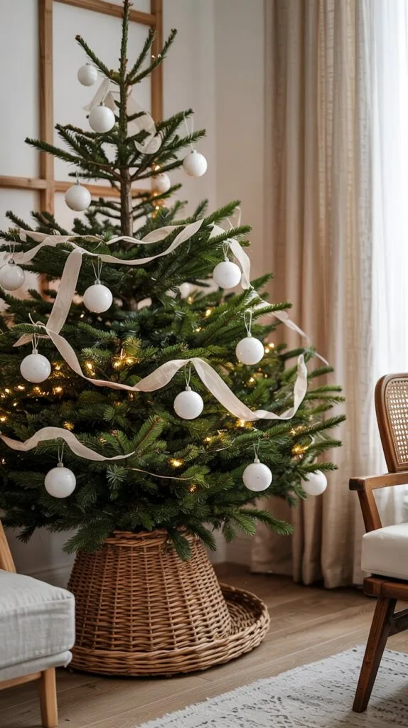 Go back to basics with a natural pine tree, simple white baubles, and a woven rattan skirt.