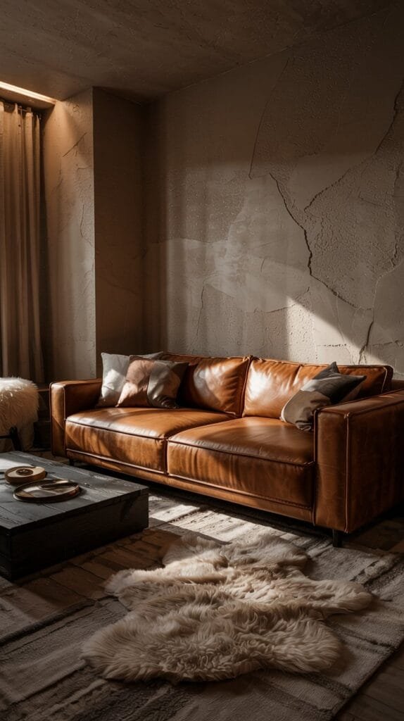 Warm minimalist living rooms use soft lighting, moody hues, and plush textures to keep things comfortable without clutter.
