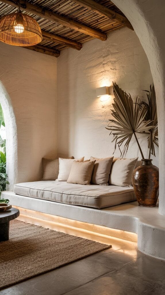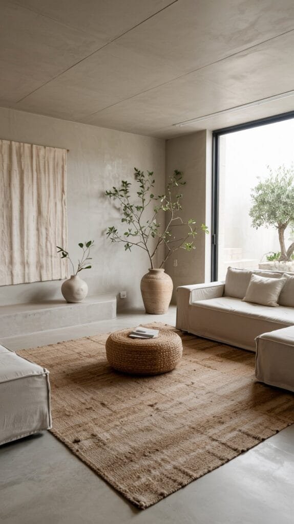 Woven textures, dried botanicals, and clay tones add a grounded feel to any neutral minimalist living room. A subtle boho flair makes the space feel lived-in.